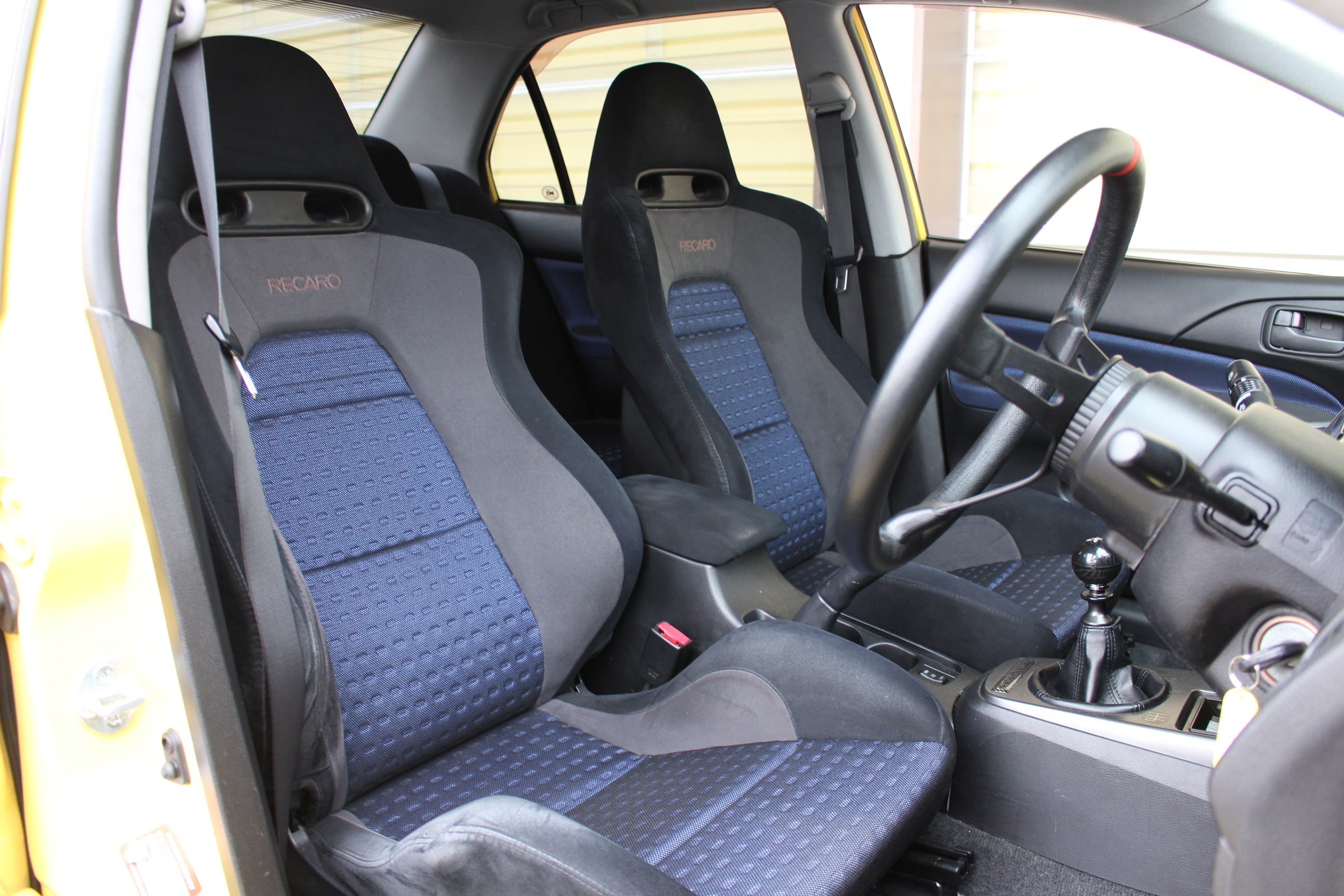 今回入庫のエボⅧは走行距離が65000kmと控えめな上、稀少なイエローソリッドのボディカラーを纏う中々お目にかかれない1台だ。フロントフェイスこそノーマルだがエアロ形状引き立つings製リアバンパーを装着している。保安適合の関係でリアウイングを外しベースのみとなっているが、ご納車後お好みでリアウイングの装着も可能だ。ウイング装着状態ではエアロとの相性が良く、リアビューは極めてレーシーな雰囲気を演出することができる。マナレイスポーツ製のブラック基調のAWと合わせて、内装も含めボディ全体がイエローとブラックのコントラストで彩られている。