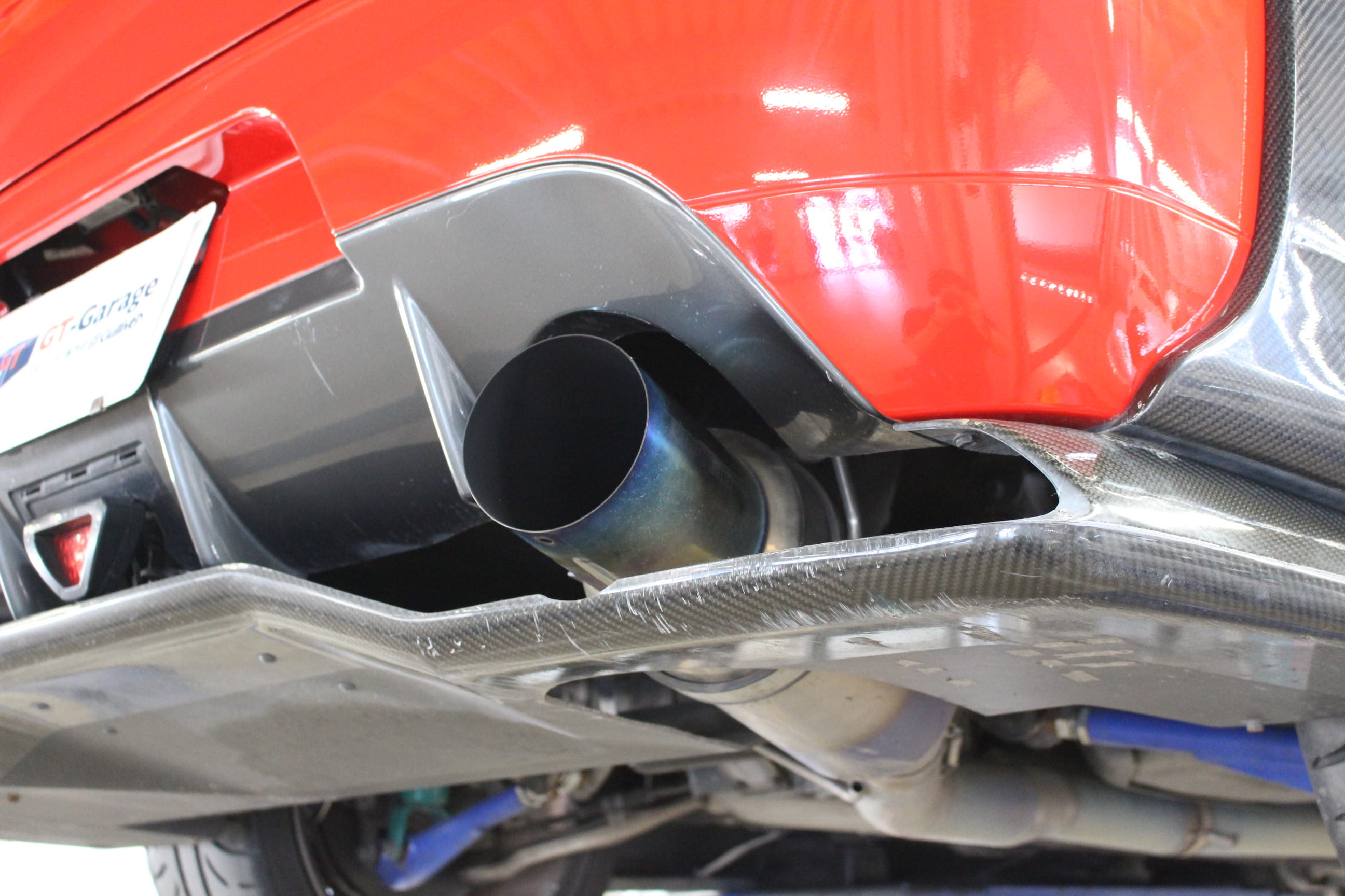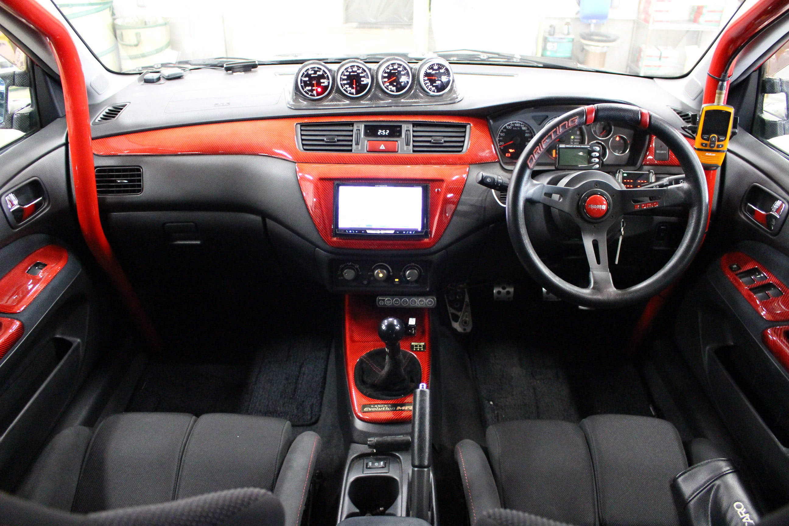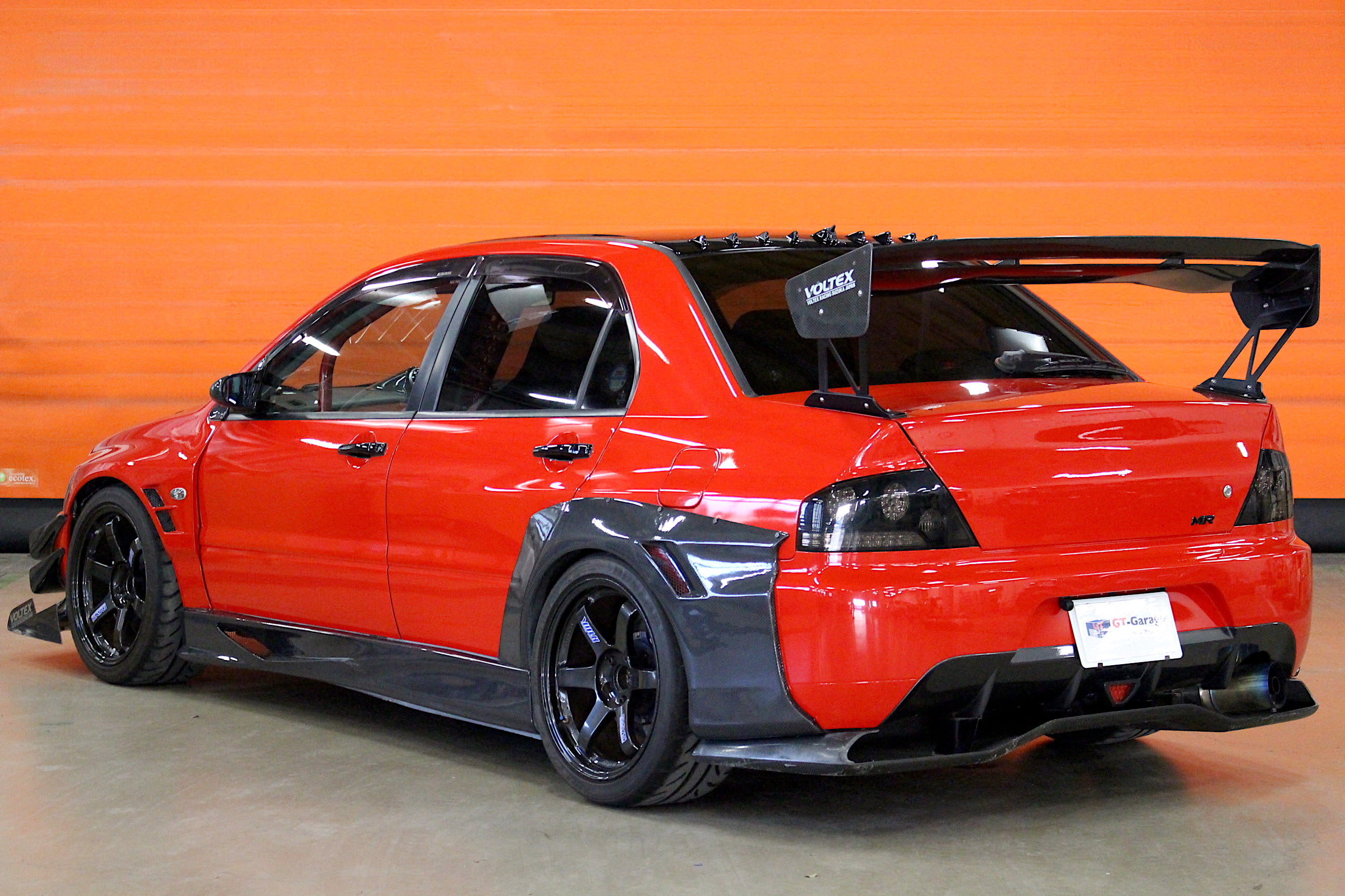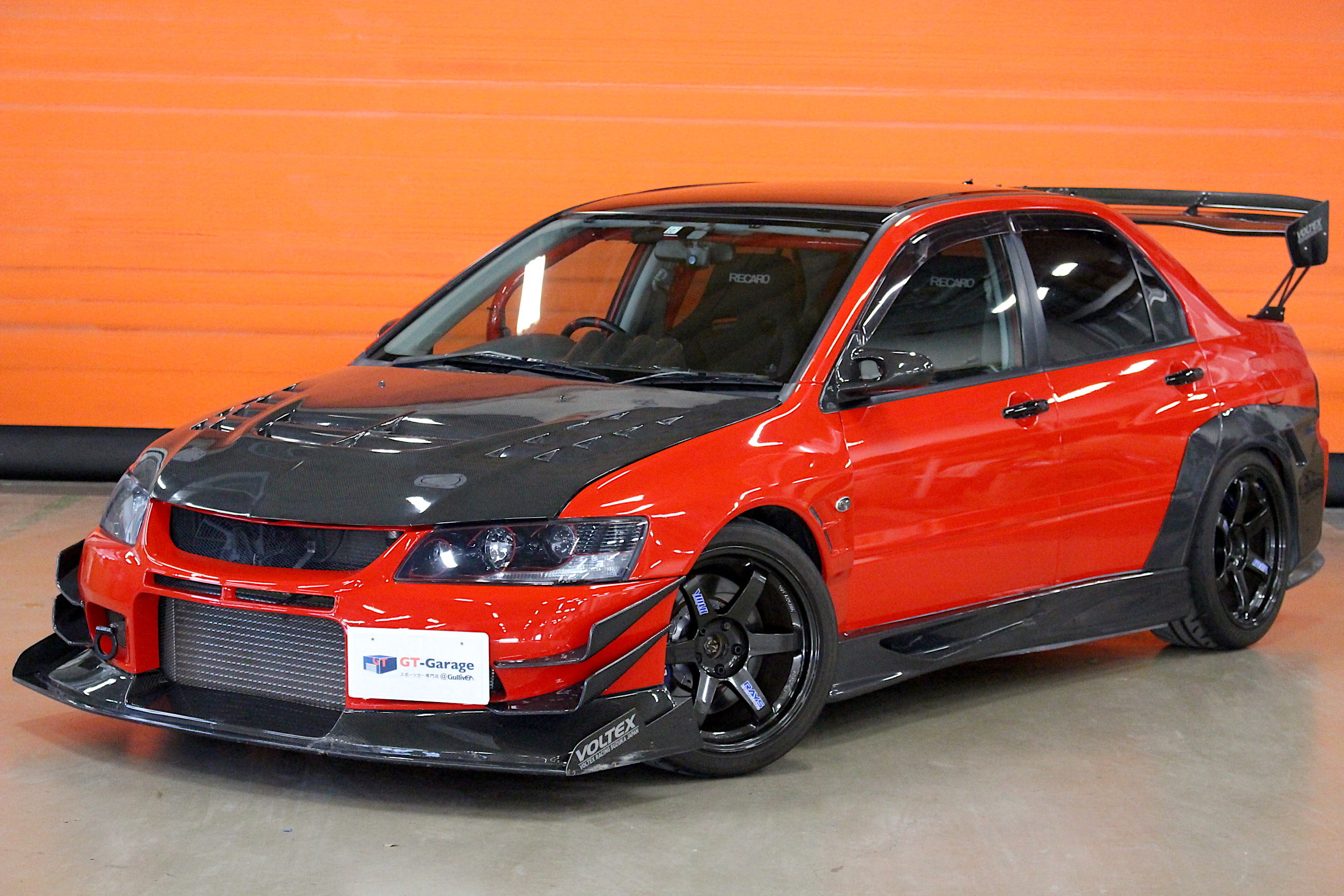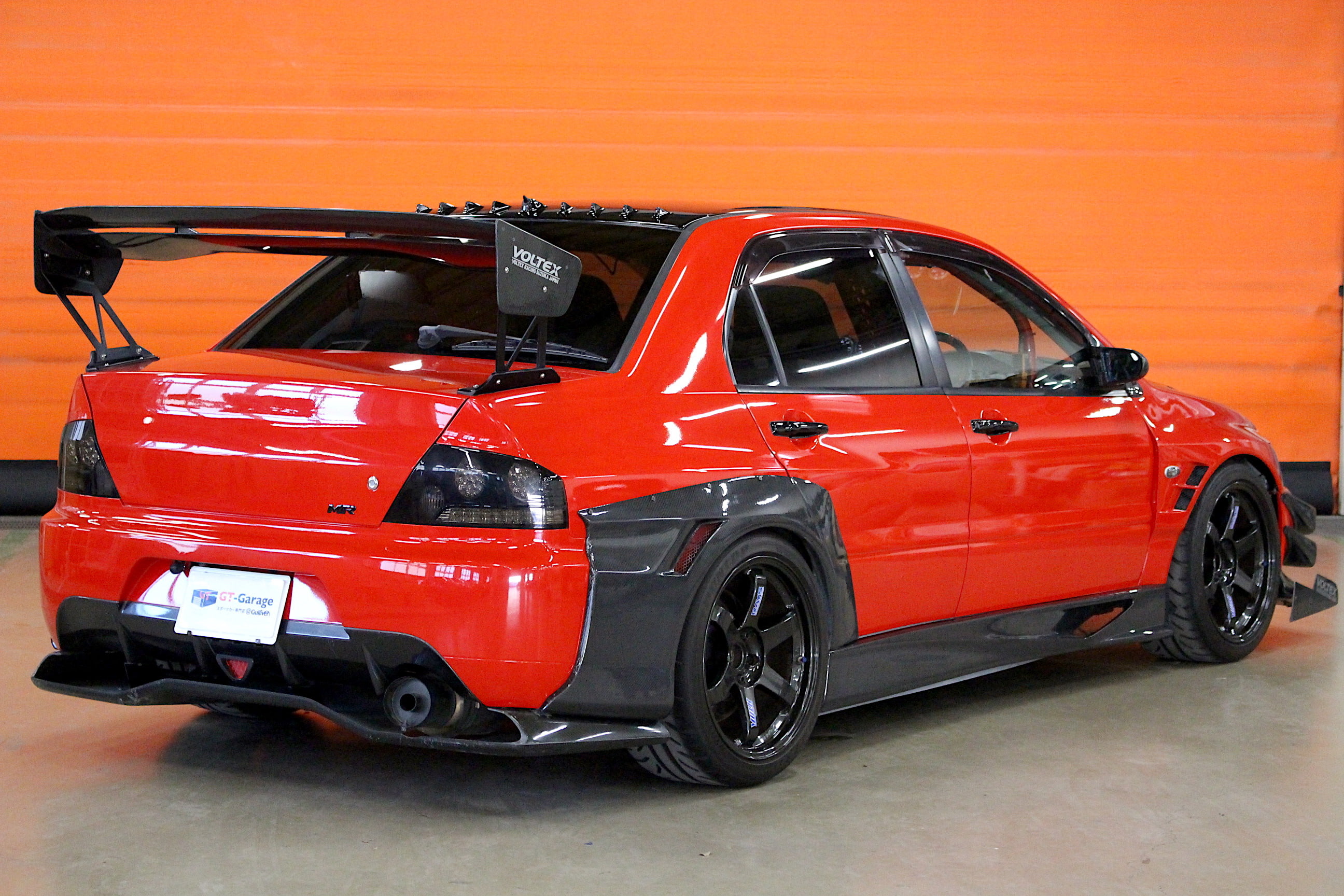 GT-Garageでは数多くのカスタマイズカーを取り扱っているが、今回入庫のランエボⅨ MRはその中でも5本の指に入るインパクト抜群の1台である。大迫力のエクステリアはカーボンパーツが印象的なVOLTEX製のフルエアロにTE37の組み合わせ、赤いボディとエアロのカーボンブラックのコントラストは思わず振り返る事間違いなしだ。その形状から強大なダウンフォースを得られる可能性が高いだろう。