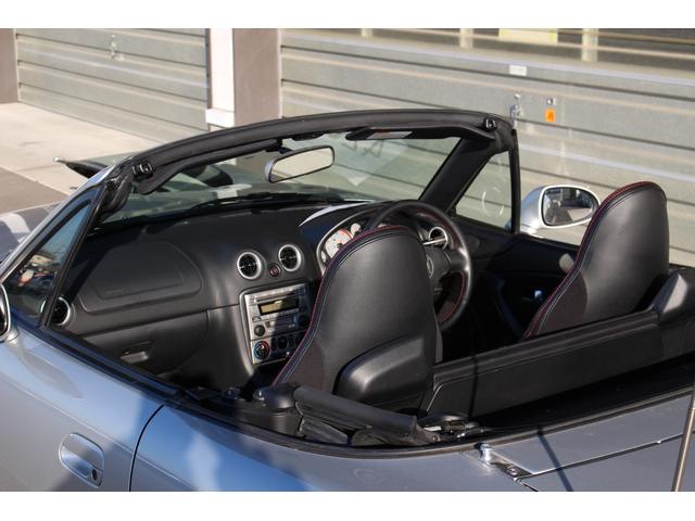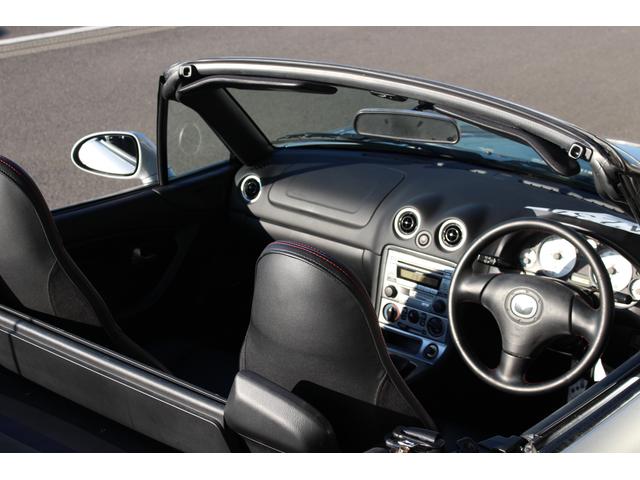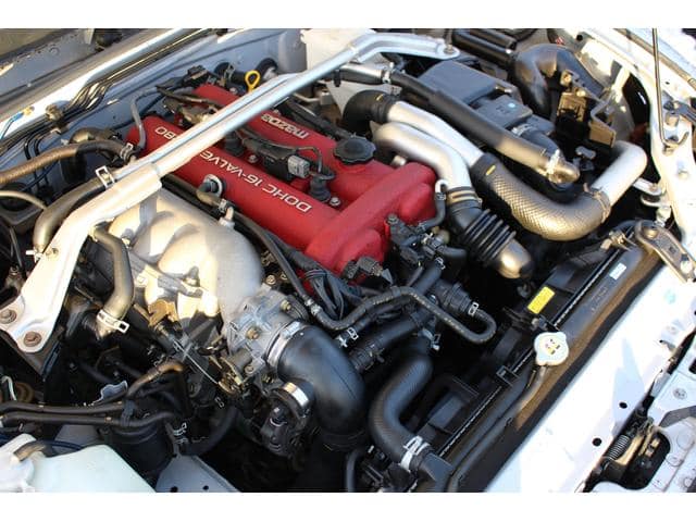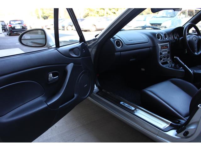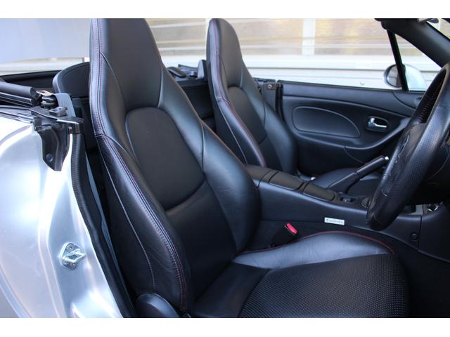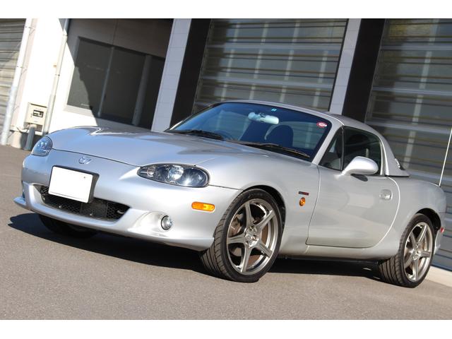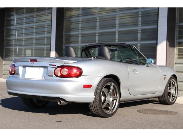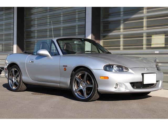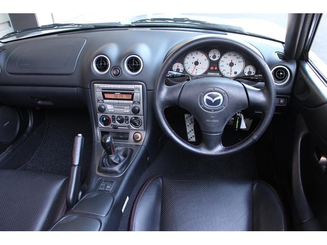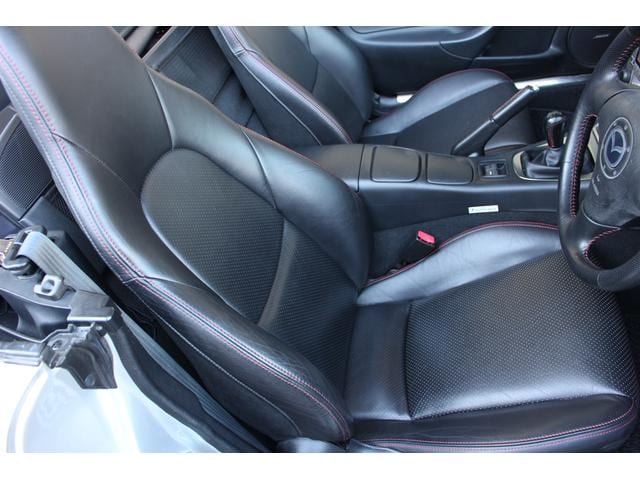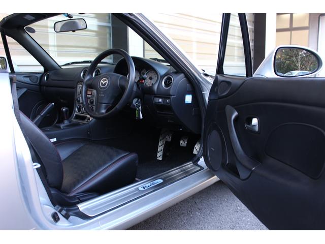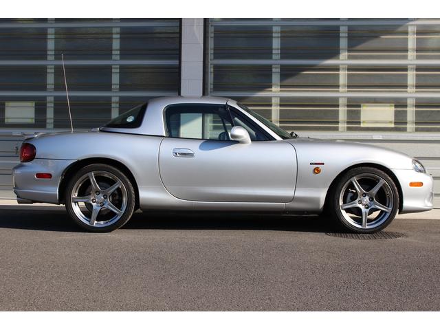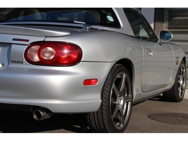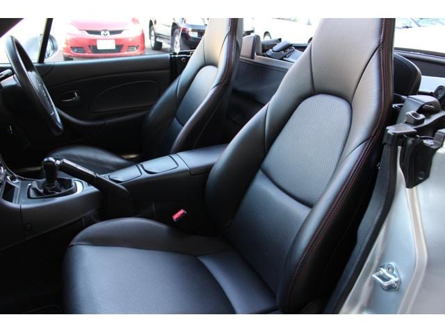 ロードスター ターボは高出力化に伴い、専用ピストンに冷却系や駆動系の強化、BILSTEINダンパーに17インチAWと各部に専用セッティングがつめられたモデル。当車両は走行距離1.2万km、ハードトップ付のメリットでソフトトップやブラック本革のインテリア各部のコンディションも保たれており、まさに貴重な一台です。