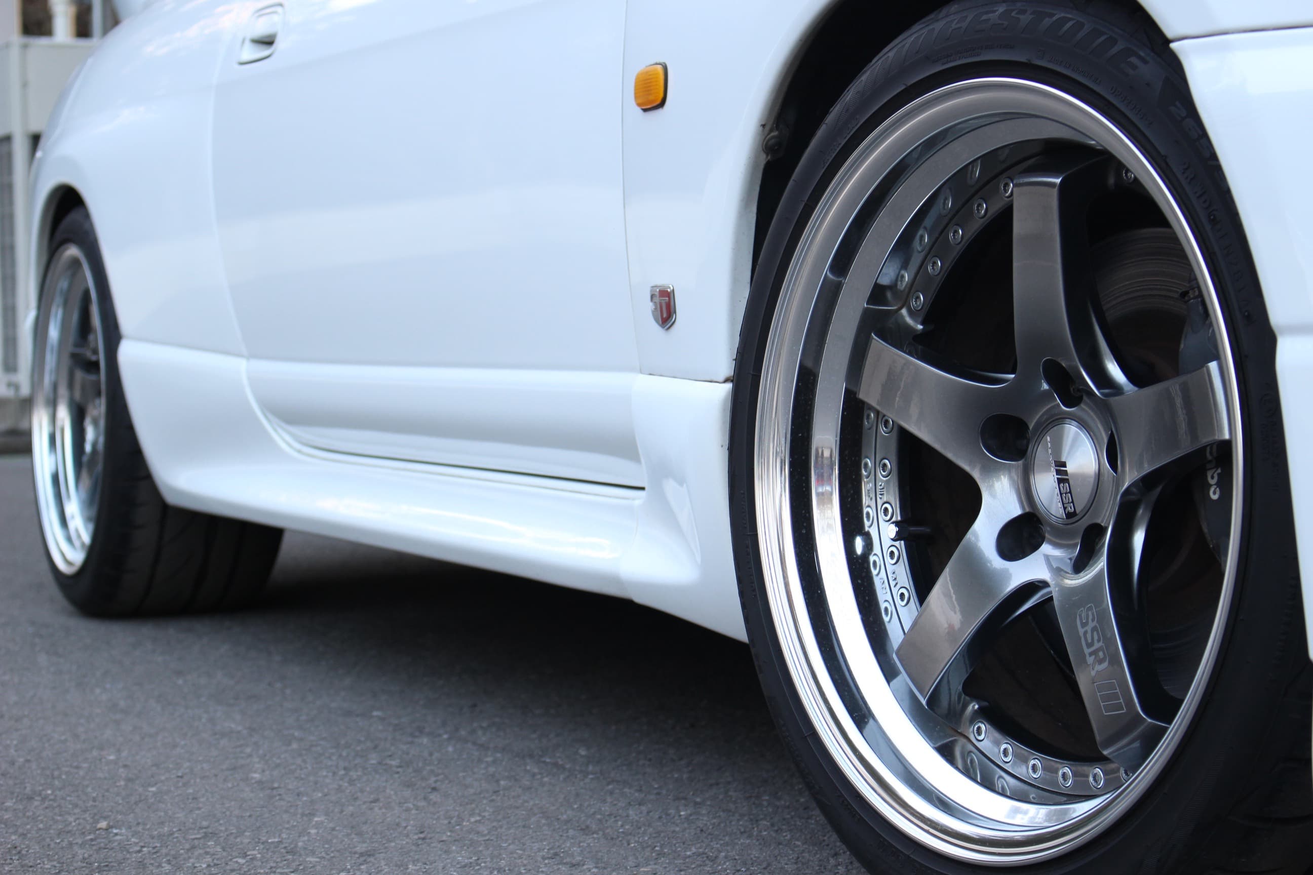 人気のホワイトカラーのBCNR33GT-R  見た目の派手さはないがアルミ製ウィングやSSR製アルミホイール、OHLINS車高調、HKSスーパーターボマフラーとバランス良く、前オーナーの細かなカスタマイズが行き届いた1台。