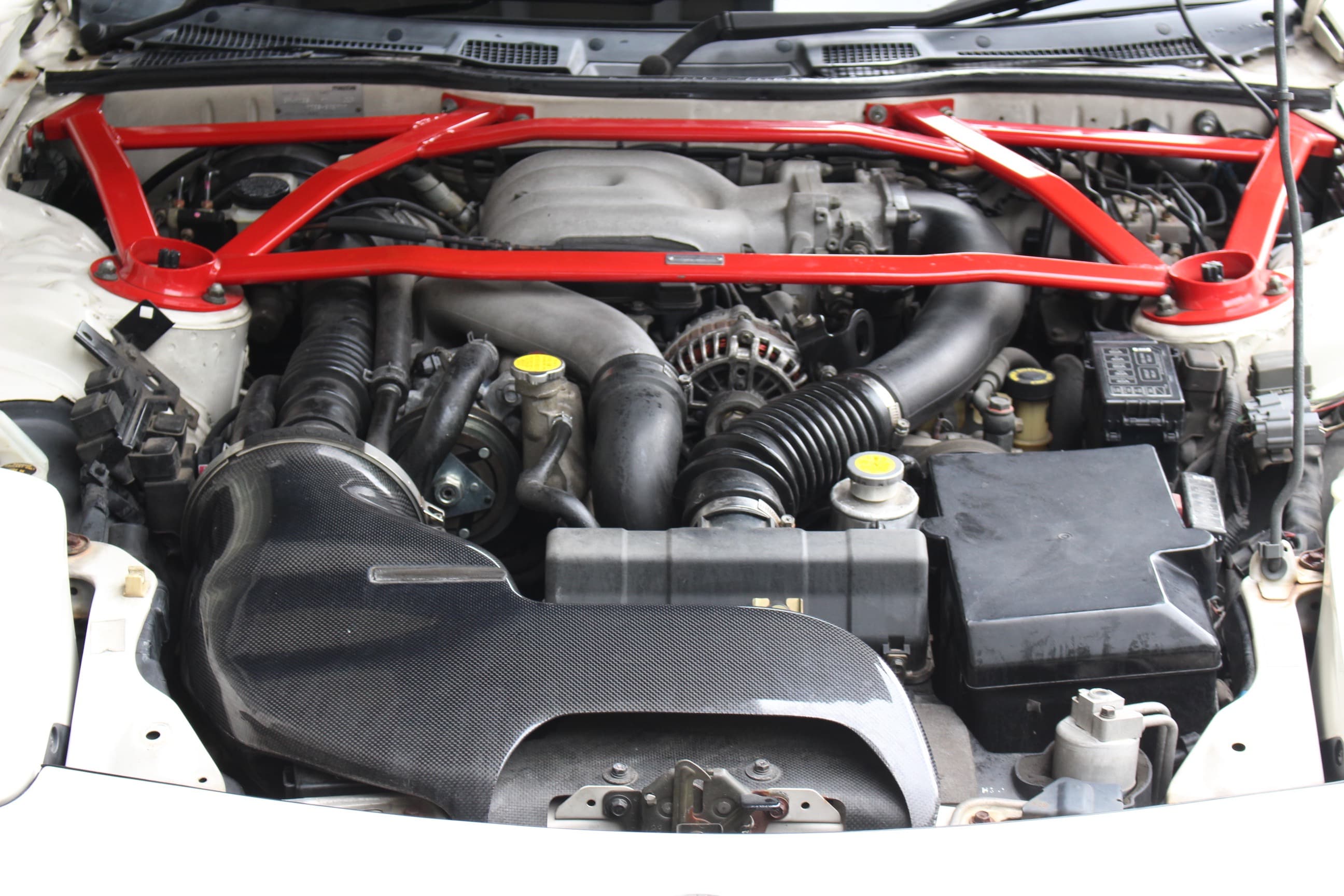 今回入庫の車両はH11年式と大規模マイナーチェンジが施された5型に該当する1台だ。このマイナーチェンジでの変更点は非常に多岐に渡るが、最も特徴的なのは5角形のグリル形状を採用したフロントエアロに大型化されたリアスポイラーで、空力や冷却へのメリットをもたらしつつよりワイド&ローなルックスに仕上げられた。