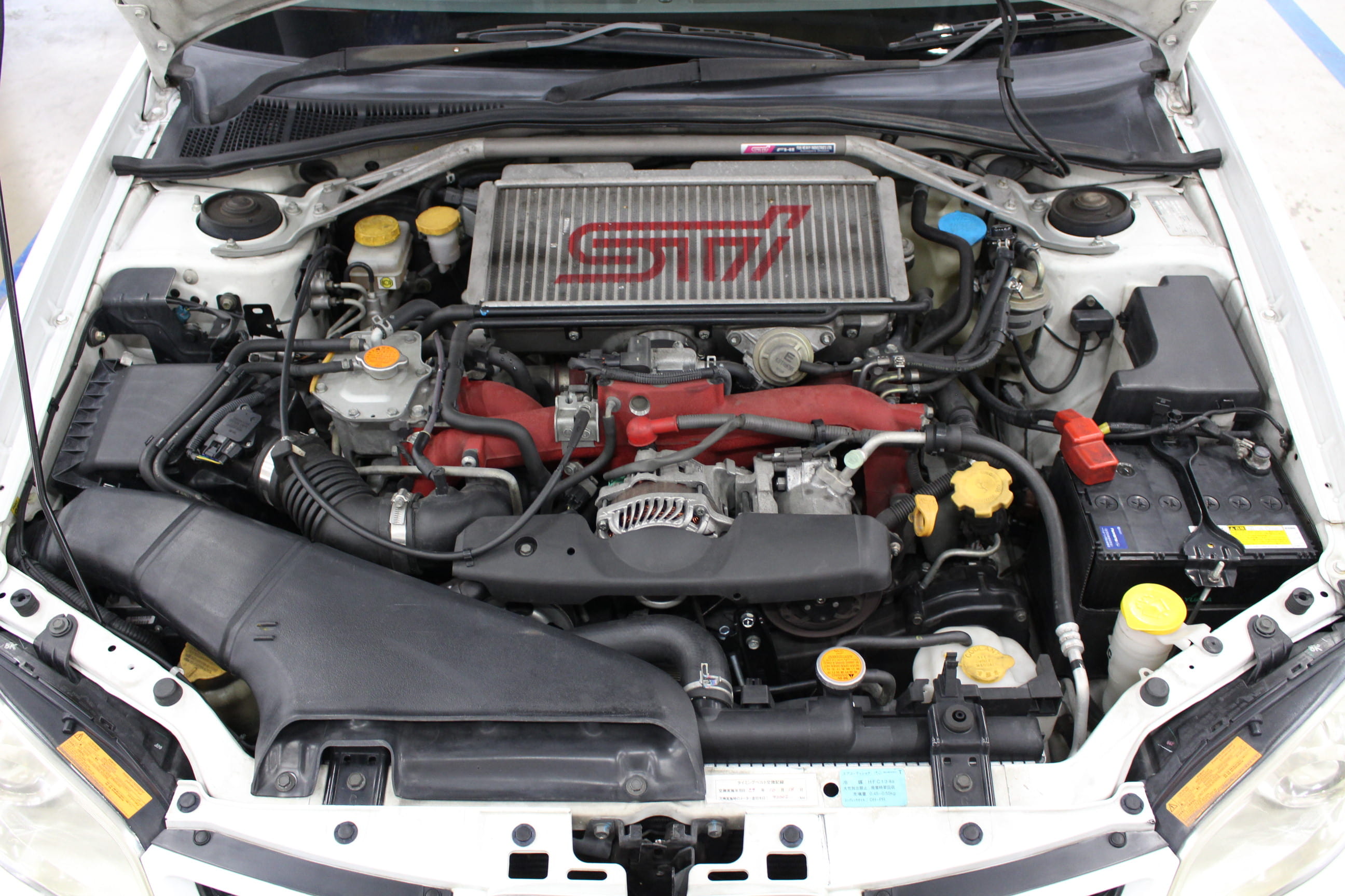 今回入庫した車両はGDBのG型通称「鷹目」である。モデルの中で2回もフェイスリフトを行い、ボディデザインの迷走が話題になった事でも有名だ。鷹目にマイナーチェンジ後の主な変更点としては、エンジン制御を変更しややマイルドな加給特性にしつつ、最大トルクは4400rpm時で43kg/fmと約7%のパワーアップ。これはトルクに関していえば現代のVAB型と同等の数値をを叩き出している。 マイルドと言ってもそのトルク感は強烈で、全身の血液が沸き立つ感覚は病み付きになるスバリストは多いだろう。