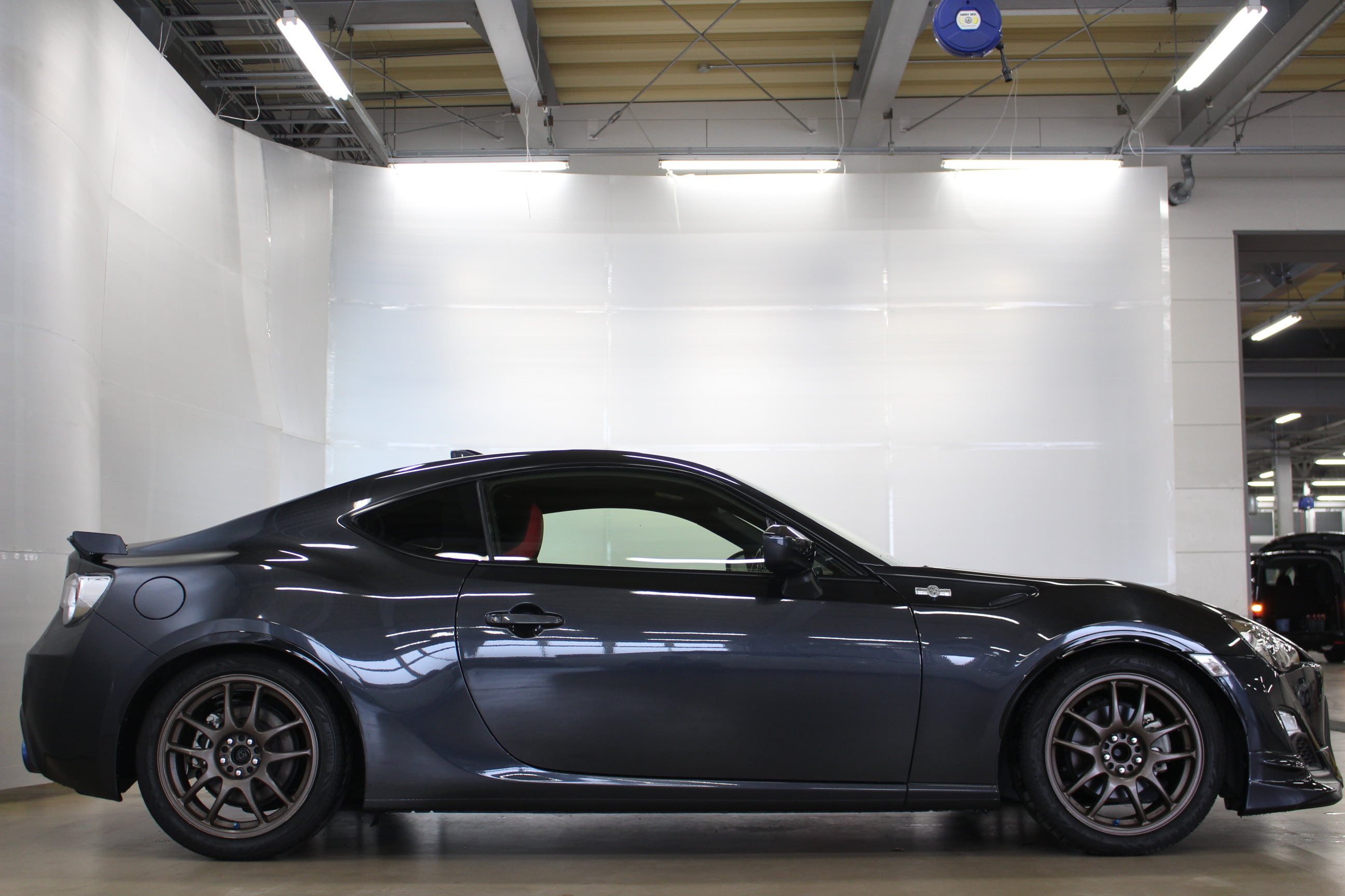 現代を代表するスポーツカーであるトヨタ86。今後5年、10年先のスポーツカー市場は86を中心に回って行く事は間違いない。今回当店でもスタディモデルとして1台の86を仕上げる事となった。ベースは28年式。あえてベーシックなGグレードを採用、フルオートエアコンやスマートキーなど一部装備は省略されるが、その分車重は1210kgとGT比で20kg程軽量になっている。エクステリアはTRDのフロントリップに後期仕様の純正リアスポイラーを装着。AWもHKSの車高調と共にスタイリッシュなWORK製に交換。柿本マフラーでエキゾーストサウンドもGoodな仕上がりだ。内装も赤黒のシートカバーでレーシーな印象に、ナビ&ETCも含め非常にお得な1台と断言できるだろう。初めてのスポーツカーという方にもピッタリな1台だ。